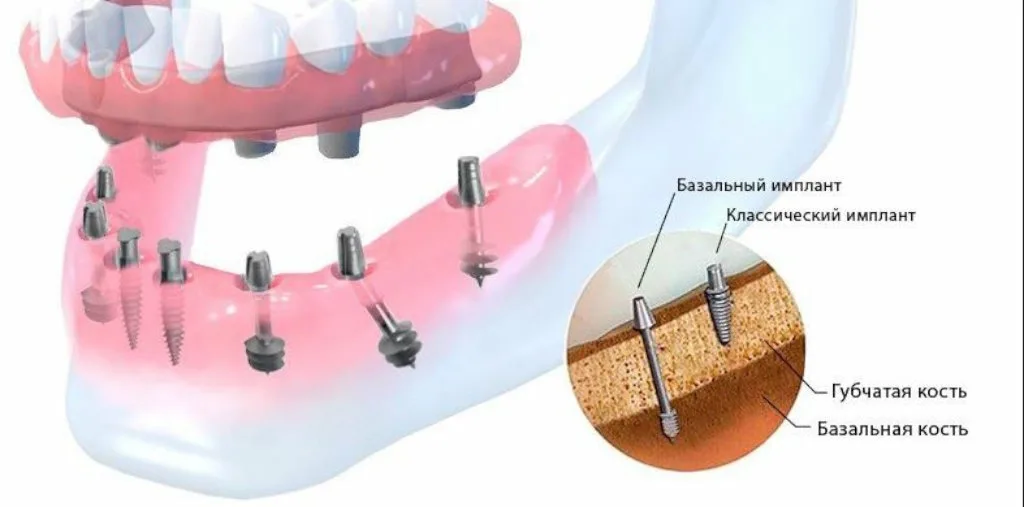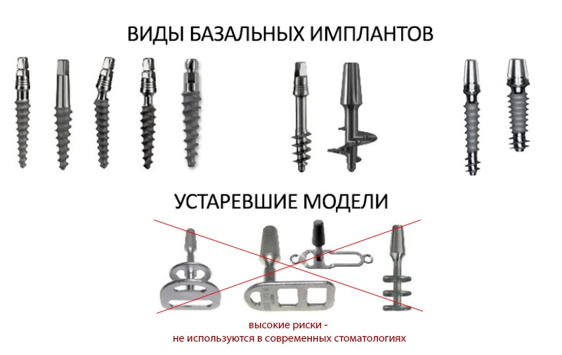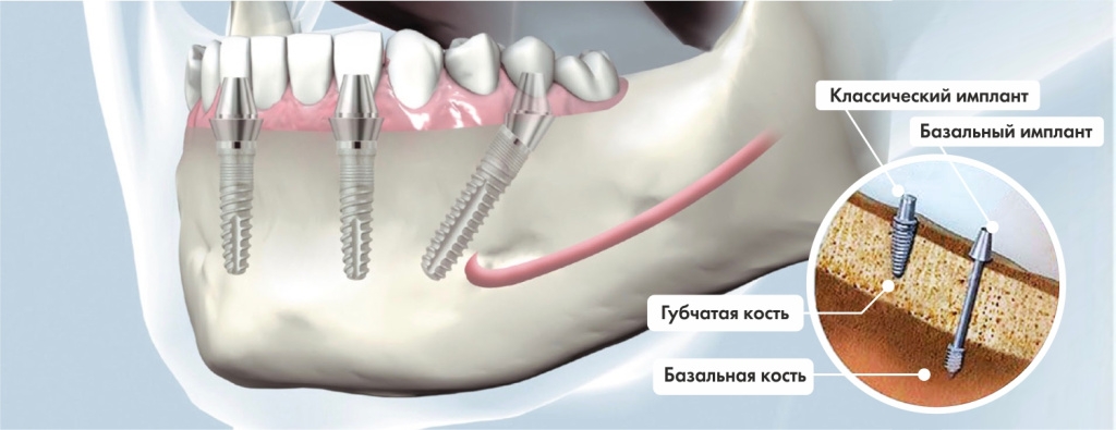 Импланты устанавливаются в твердую базальную кость для плотной фиксации и равномерного распределения нагрузки. Преимуществом этого метода является закрепление импланта без наращивания костной ткани, но этот вид имплантации применяют редко из-за большого количества противопоказаний.